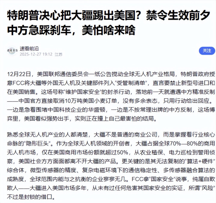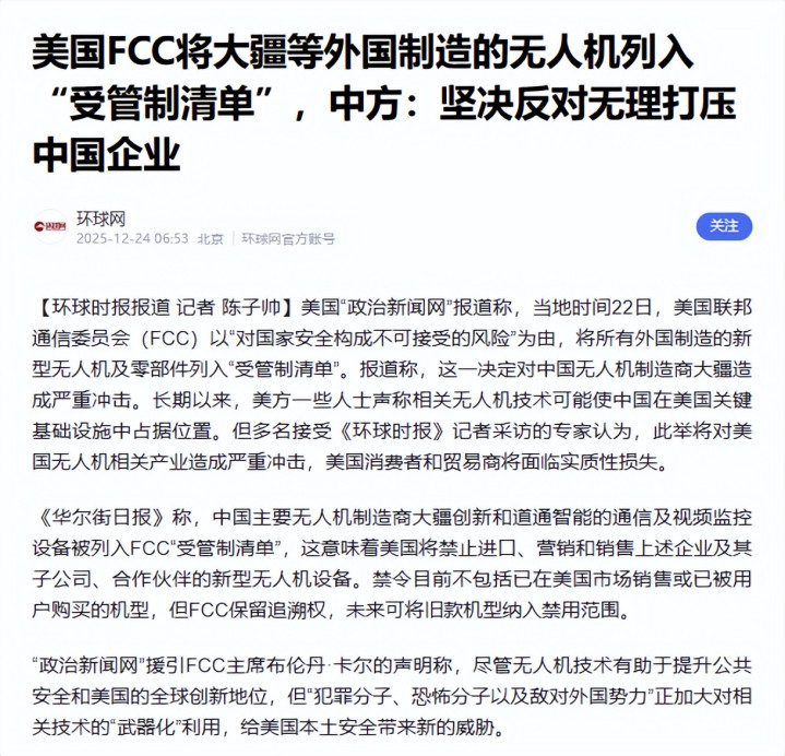 短短两个月后,美国再次露出獠牙,12月22日,美联邦通信委员会直接对无人机领域进行制裁,虽然表面上说是针对所有外国制造的无人机,但谁都知道,中企占全球绝对主导地位,这一纸禁令摆明了就是针对中国。