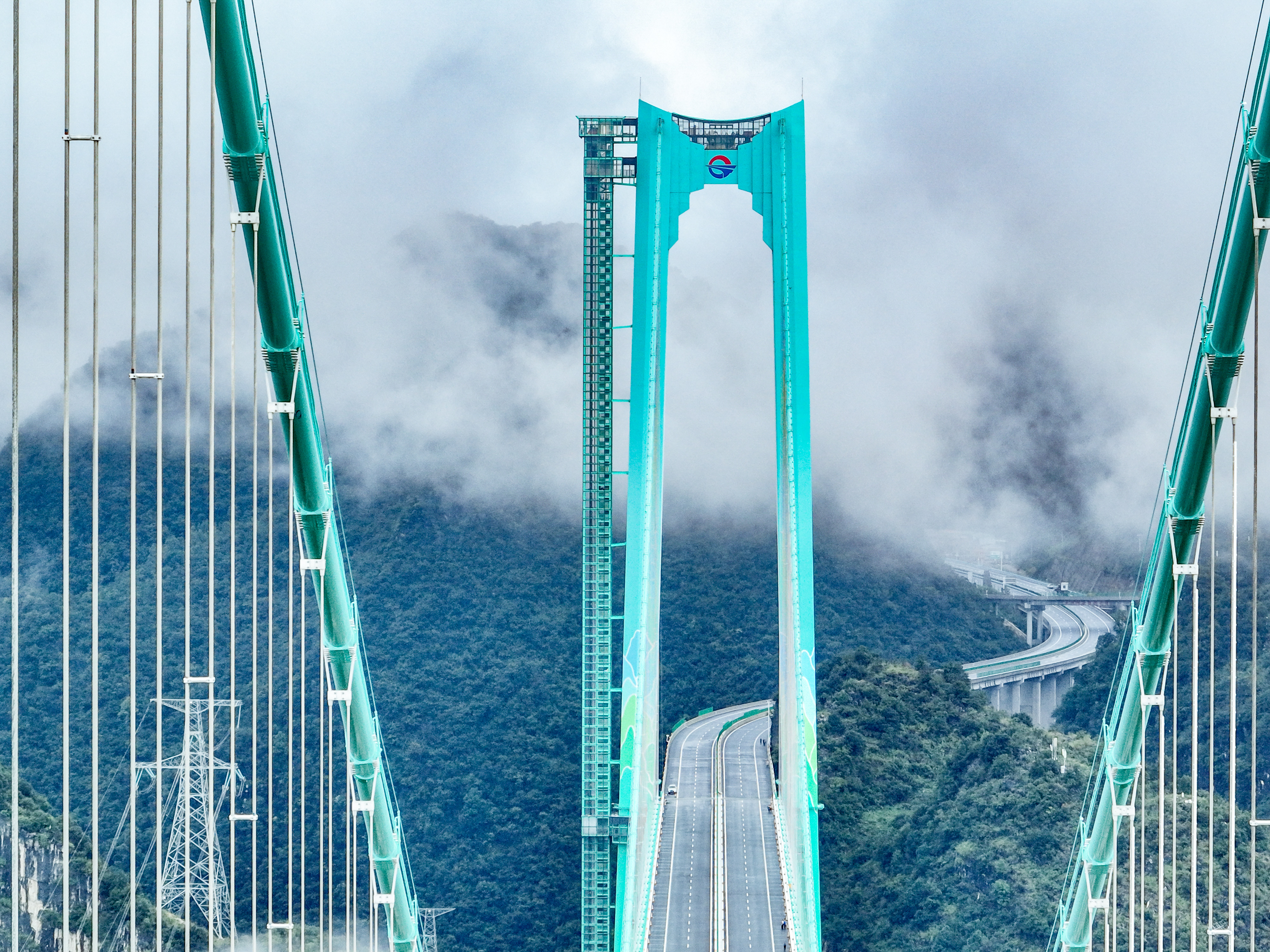 花江峡谷大桥钢桁梁吊装有93个节段,总重达2.1万吨,需在600多米高空实现毫米级精准对接。建设团队借助研发的“智慧缆索吊装系统”,全部吊装仅用了73天就全面完成;3.8万平方米的桥面,建设团队在1个多月里完成了5层铺装……